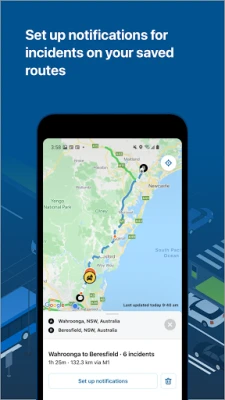 Live Traffic NSW pakub detailset infot kõigest, mis liiklusele mõju avaldab – alates avariidest ja riketest kuni tulekahjude, üleujutuste, lumetormide, avalike ürituste ja teetöödeni Sydney ja kogu piirkondlikus NSW-s. Näete strateegiliselt paigutatud liikluskaamerate reaalajas pilte, mis värskendatakse iga 60 sekundi järel ja mida saate kiireks ligipääsuks salvestada. Lisaks saate mugavalt kontrollida intsidente oma planeeritud marsruudil ja salvestada sageli läbitavad teekonnad, et säästa aega ja vältida ebameeldivaid üllatusi. See hõlmab ka piiriülest infot QLD, SA, VIC ja ACT piirkondadest, samuti tulekahjude asukohti NSW maapiirkondade tuletõrje teenistuselt ja kohalikke teedeandmeid Põhja-NSW-s (pakub myroadinfo.com.au).