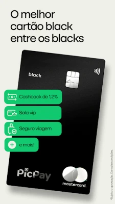 Vali endale sobiv PicPay kaart, mis on loodud Sinu elustiili silmas pidades – olgu selleks aastatasuta PicPay Card Gold koos rahatagastuse ja Mastercard Surpreenda eelistega, PicPay Card Platinum 0,5% rahatagastusega kõikidelt ostudelt ja globaalse hädaabiga või eksklusiivne PicPay Card Black, mis pakub 1,2% rahatagastust, VIP-lounge'i juurdepääsu ja reisikindlustust. Lisaks neile eelisele pakub PicPay ka paindlikke laenulahendusi: isiklikke laene ootamatuteks olukordadeks või unistuste elluviimiseks ning FGTS-i ettemakseid, mis jõuavad Sinu kontole vaid minutitega, pakkudes lihtsat heakskiitu ka neile, kelle krediidiajalugu pole laitmatu.