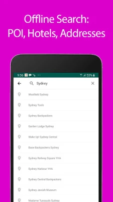 Avasta ja koge rakendusega 'Sydney Offline Map and Travel' kaunist Sydneyt isegi ilma internetita! Tasuta võrguühenduseta kaart aitab säästa rändluskulusid ja töötab kiiresti igas olukorras – isegi metroos või lennukis. Leia hõlpsalt turismiatraktsioonid koos Wiki kirjeldustega, otsi aadresse ja navigeeri mööda linna. Saad salvestada lemmikkohti ja paid versioonis kasutada ka auto- või jalakäija GPS-navigatsiooni. Ideaalne reisikaaslane Sydney avastamiseks!"