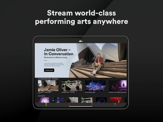 Sydney Ooperimaja kutsub teid ühinema meie ülemaailmse kunstihuviliste kogukonnaga. Avastage "Stream" abil uus ja kaasahaarav etenduskogemus oma mobiiltelefonis, lauaarvutis või tahvelarvutis, olenemata teie asukohast. See on teie võimalus olla osa elavast ja arenevast kultuuriruumist, kus maailmatasemel etenduskunst on vaid puudutuse kaugusel. Kogege Sydney Ooperimaja vaimu ja inspiratsiooni, pakkudes teile enneolematut juurdepääsu lavadele, mis on inspireerinud miljoneid.