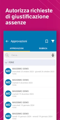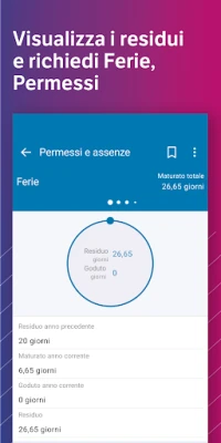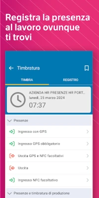 Tööaja ja puhkuste haldamine pole kunagi varem olnud nii lihtne. Kontrollige oma puhkuste, lubade, ROL-i, endiste pühade ja tunnipanga jääke. Esitage puhkuse- ja päevapuhkuse taotlusi ning jälgige nende kinnituse staatust otse rakendusest. Haiguse korral saate mugavalt teavitada oma ettevõtet, saates INPS-protokolli ja arstitõendi tööandja koopiana. Lisaks saate taotleda põhjendusi muudeks puudumisteks (nt veredoonorluse luba, õppepuhkus, L.104 load) ja jälgida nende staatust. Rakendus pakub ka mobiilset töölkäimise märgistamist, sh geolokatsiooniga, ja võimalust sisestada tööaeg klientidele/projektidele/tegevustele, kasutades isegi automaatset andmete kogumist TAG/NFC kaudu.